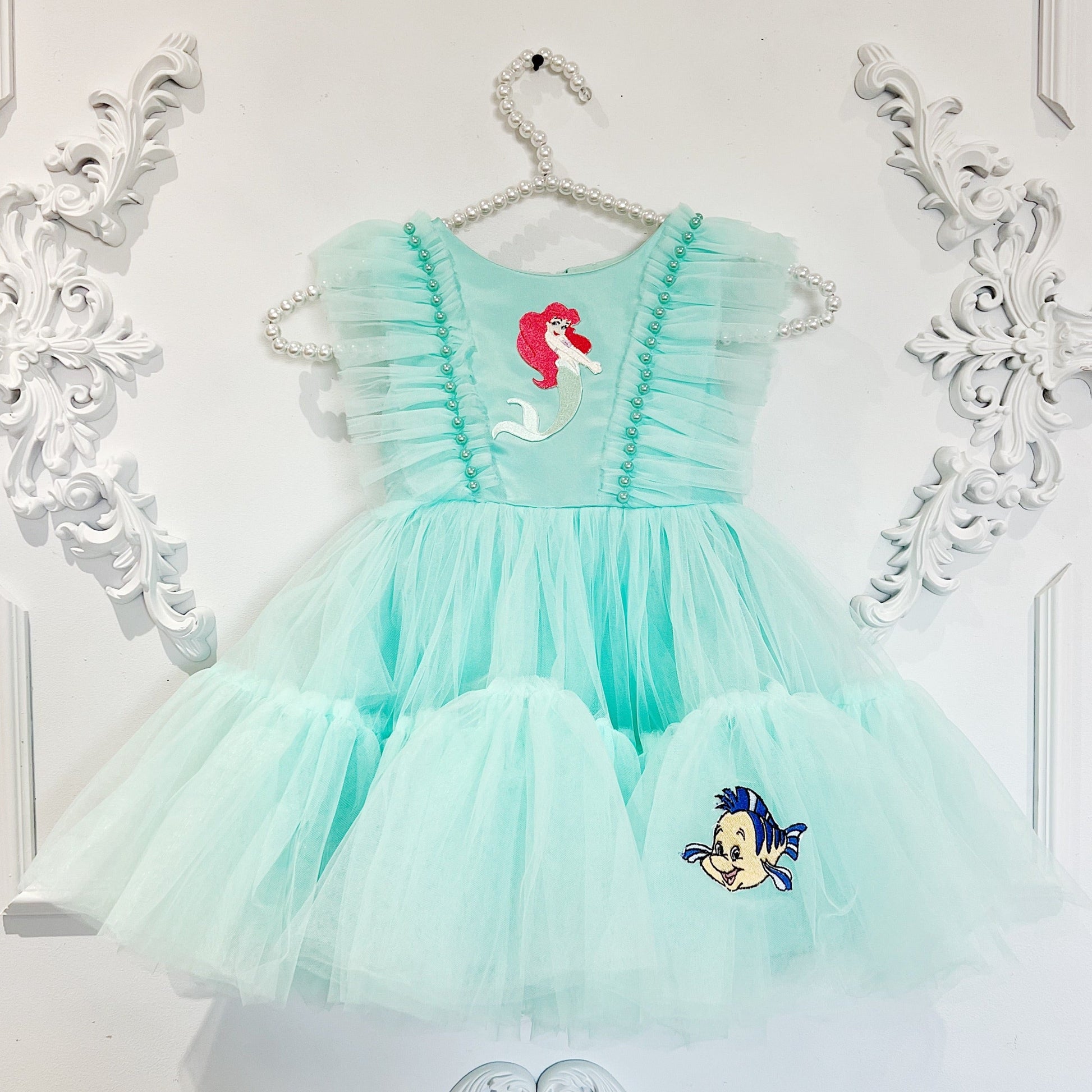 Beautiful dress that is not handmade but made by our suppliers. We added beautiful embroidery to it and turned it into something magical! This teal dress has a Little Mermaid patch on it and a flounder.